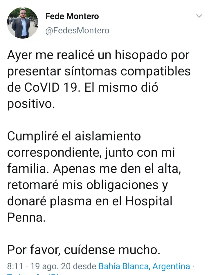 Federico Montero, el hombre encargado de ser nexo entre el Ministerio de Seguridad de la provincia de Buenos Aires y la policía de Bahía Blanca, anunció en sus redes sociales que dio positivo en el test de COVID-19.