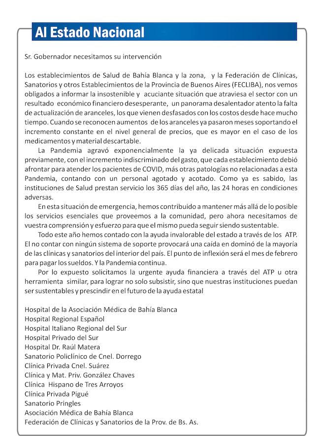 En un comunicado enviado por la Asociación Médica de Bahía Blanca hizo un petitorio al Gobernador Kicillof, para su intervención con respecto a la situación económica que atraviesan y un panorama desalentador ante la continuidad del Covid-19.