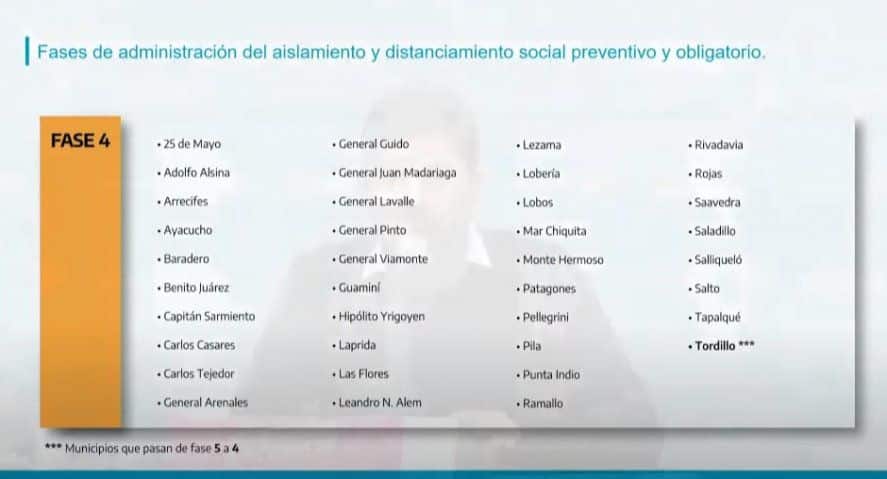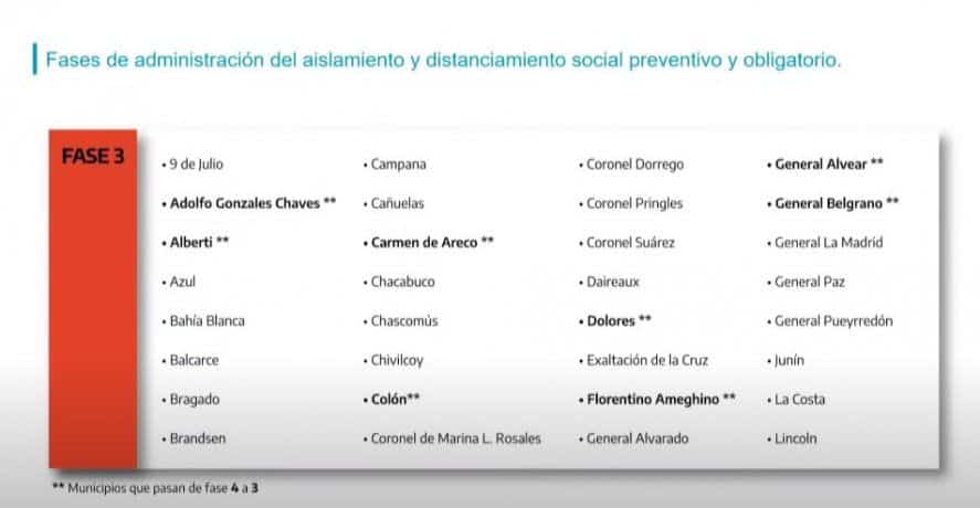 En la conferencia de prensa de esta mañana ratificó a Bahía Blanca en fase 3. En el marco de actualización, sostuvo “Tenemos 39 municipios en fase 2, los 35 del AMBA más otros cuatro del interior bonaerense (Bolivar, Zárate, General Villegas, y Castelli), 58 en fase 3, se sumaron 14 que estaban en fase 4, hay 38 municipios en fase 4, ahondó Bianco.