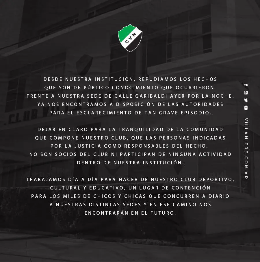 En un comunicado de prensa, el club repudió el hecho y destacó que los dos detenidos “no son socios del club ni participan de ninguna actividad dentro de nuestra institución”.