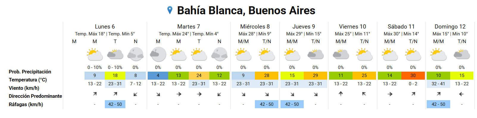 El viernes habrá un leve descenso a 25°C, pero el sábado volverá el calor fuerte con 30°C de máxima y 14°C de mínima, en una jornada a pleno sol. El domingo se notará un cambio fuerte en la temperatura. El viento sur hará que la máxima llegue a los 15°C de máxima, cielo mayormente nublado.