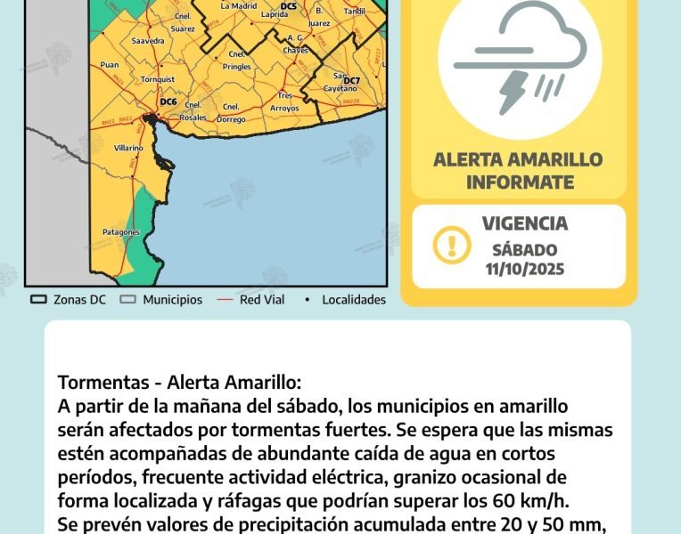 Las zonas afectadas serán: Bahía Blanca – Oeste de Patagones – Oeste de Villarino – Puan – Zona baja de Coronel Pringles – Zona baja de Coronel Suárez – Zona baja de Saavedra – Zona baja de Tornquist