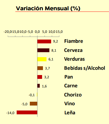 Entre los elementos que conforman “prender el fueguito” lo que mas aumentó fue el fiambre con un 9.2%, luego la cerveza (8.1%) y las verduras con un 6.3%. En tanto bebidas sin alcohol (+3.7%), pan (+3.2%) y carne (+1.6%).