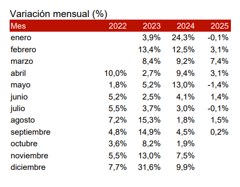 Para septiembre tuvo un aumento (leve) en 0.2%, Un acumulado en el año de 15.8%, y 39.5% de manera interanual, de sept 2024 a sept 2025).