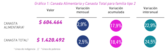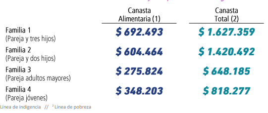En octubre, la Canasta Básica Alimentaria (CBA) necesaria para cumplir con los requerimientos alimentarios de una familia tipo 2 (padre, madre y dos hijos en edad escolar) se ubicó en $ 604.464, exhibiendo un alza de 2,9% con respecto al mes anterior. Por su parte, la Canasta Básica Total (CBT) para la misma familia costó $ 1.420.492 que son necesarios para cubrir sus consumos básicos, tanto alimentarios como no alimentarios, y así superar el umbral de pobreza.