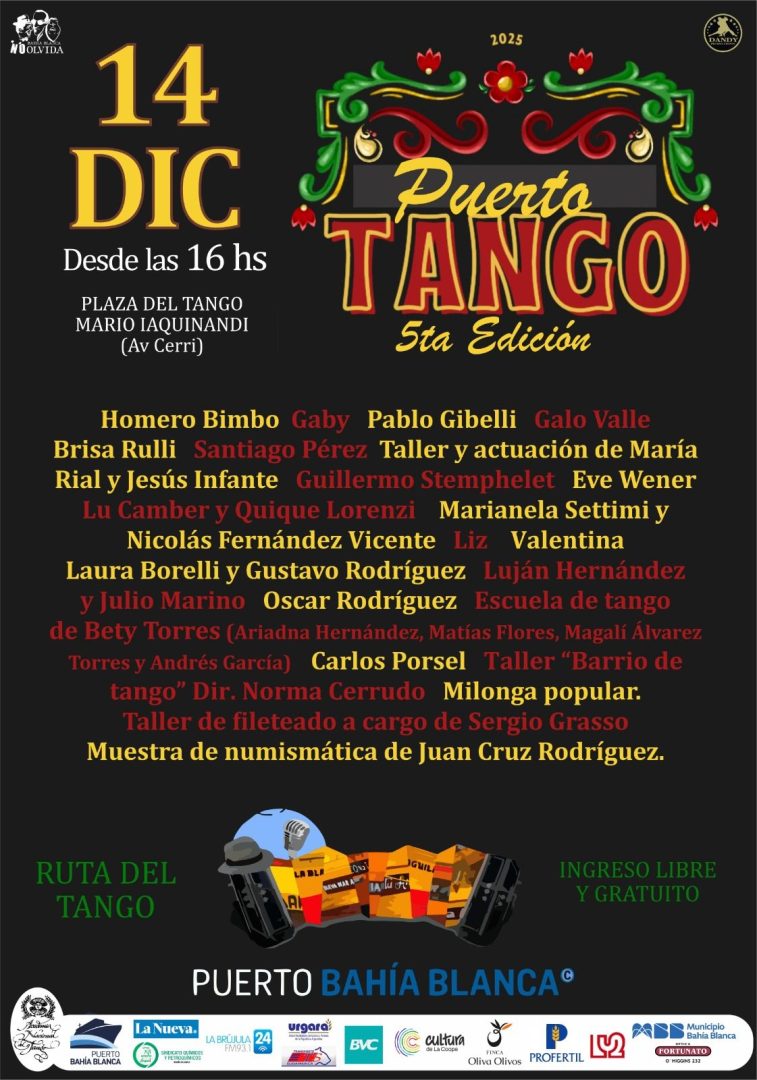 En la Plaza Del Tango Mario Iaquinandi desde las 16, se llevará a cabo la quinta edición de “Puerto Tango” con la actuación de Gaby “la voz sensual del tango”, Homero Bimbo, Galo Valle, entre otros artistas. Estará presente el taller de baile y exhibición de Jesús Infante y Maria Rial, Pablo Gibelli, los bailarines de la escuela de tango de Bety Torres; el taller “Barrio de tango” dirigido por Norma Cerrudo y cierre con milonga popular.