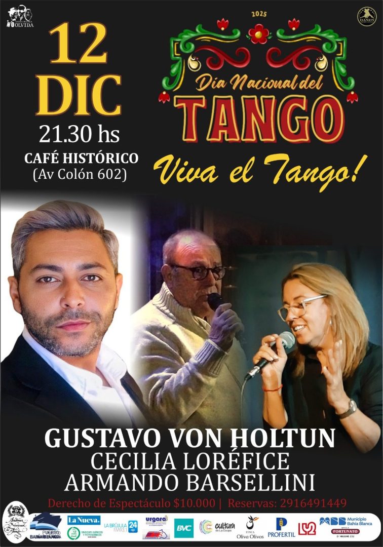 A las 21.30 en el Café Histórico (Colón 602, esquina Italia) se presentará el espectáculo “Viva el Tango” protagonizado por Gustavo Von Holtun, Cecilia Lorefice y Armando Barsellini. Las reservas pueden hacerse al 2916491449.