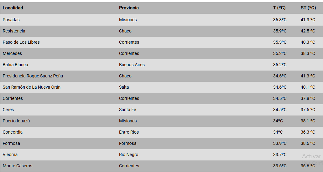 El listado fue encabezado por Posadas, con 36,3°C, seguida por Resistencia (35,9°C), Paso de los Libres (35,3°C) y Mercedes (35,2°C). Bahía Blanca compartió valores similares, aunque con una humedad relativa del 25%, condición que potencia la sensación térmica y el riesgo de deshidratación.