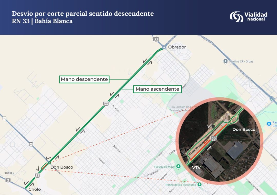 Ese desvío comienza en la rotonda Don Bosco y permite retomar la Ruta 33 en la dársena de acceso a la planta de Verificación Técnica Vehicular (VTV), un sector habitual de circulación para el tránsito pesado y el movimiento diario de automovilistas.