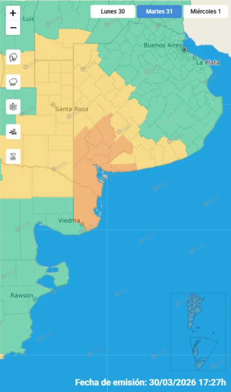 El Servicio Meteorológico Nacional (SMN) emitió este lunes por la tarde una alerta naranja por tormentas para la madrugada del martes 31 de marzo en la franja costera del sudoeste bonaerense, incluyendo Bahía Blanca, Coronel Dorrego, Coronel Rosales, Villarino y Monte Hermoso. El parte oficial, generado a las 17:27, también ratificó el alerta amarillo vigente para la noche de este lunes y para la mañana y tarde del martes, en una jornada que se anticipa complicada desde el punto de vista climático.