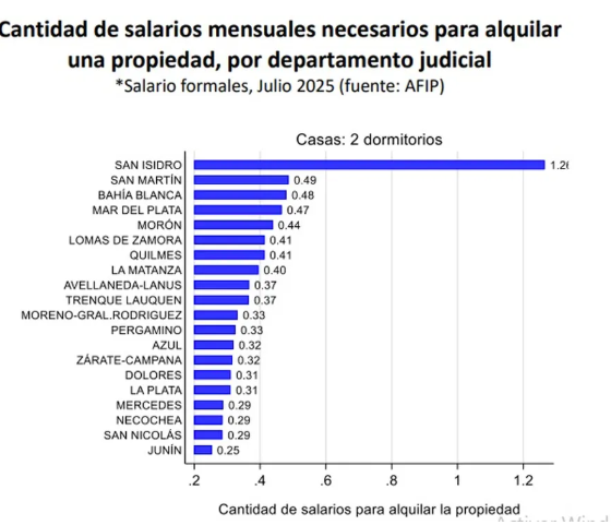 Al respecto, en el departamento judicial de Junín, por ejemplo, se destina el 0,25 de ese salario promedio para pagar el alquiler, mientras que San Nicolás, Necochea y Mercedes salta al 0,29. En lo que sería la “mitad de la tabla”, aparecen los distritos con cabecera en Trenque Lauquen y Avellaneda-Lanús (0,37); y en la parte más alta están Mar del Plata (0,47) y Bahía Blanca (0,48). Una cifra similar, donde se destina casi la mitad del salario para alquilar está el departamento judicial de San Martín (0,49), mientras que en San Isidro trepa a 1,26.