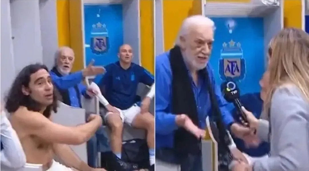 Sin embargo, todo se tornó tenso cuando Sofía Martínez, que se encargó de hacer las notas en la transmisión del homenaje, ingresó a los vestuarios de ambos conjuntos para obtener declaraciones de los que iban a participar de la despedida. Pero cuando entró al de la Selección al Coco Basile no le gustó nada.