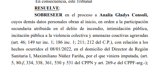 La Justicia Federal con la firma del Juez Sebastián Foglia, sobreseyó a Analía Consoli, en la causa que investiga el atentado sufrido el domicilio particular del Dr. Maximiliano Núñez Fariña, titular de Región Sanitaria
