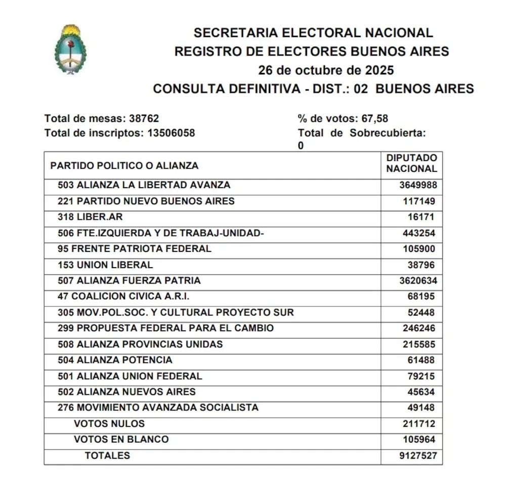 El escrutinio definitivo que realizó la Justicia Electoral confirmó la victoria de La Libertad Avanza sobre el peronismo de Fuerza Patria en la categoría diputados nacionales por la provincia de Buenos Aires por una diferencia de menos de 30 mil votos.