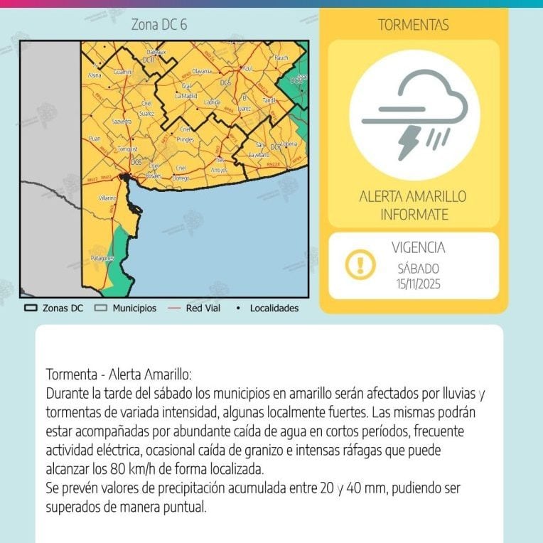 El informe de la municipalidad de nuestra ciudad, basándose en el informe del Servicio Meteorológico nacional, anuncia que mañana sábado se esperan lluvias y tormentas principalmente entre las 14-15 horas y 21 horas, avanzando de oeste a este.