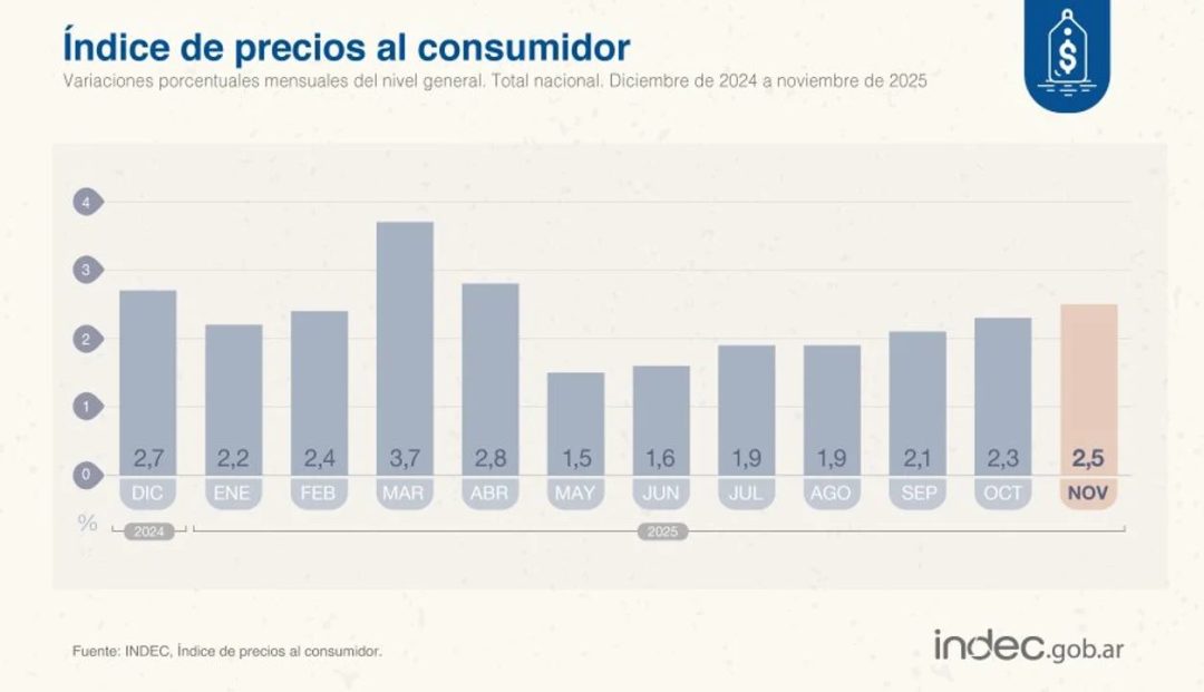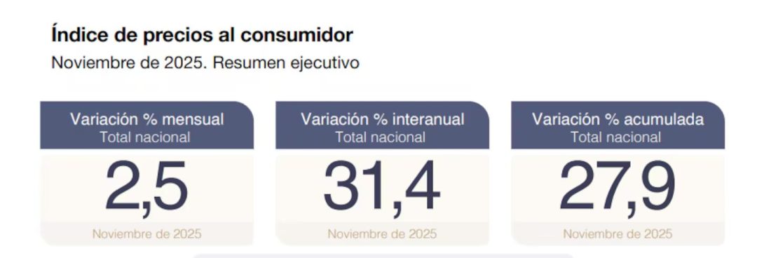 El Índice de Precios al Consumidor (IPC) registró un aumento del 2,5% en noviembre de 2025 respecto al mes anterior, una nueva aceleración del índice que se ubica por encima del 2,3% registrado en octubre. De esta forma, la inflación acumulada en once meses alcanzó el 27,9%, mientras que la variación interanual se ubicó en el 31,4%.