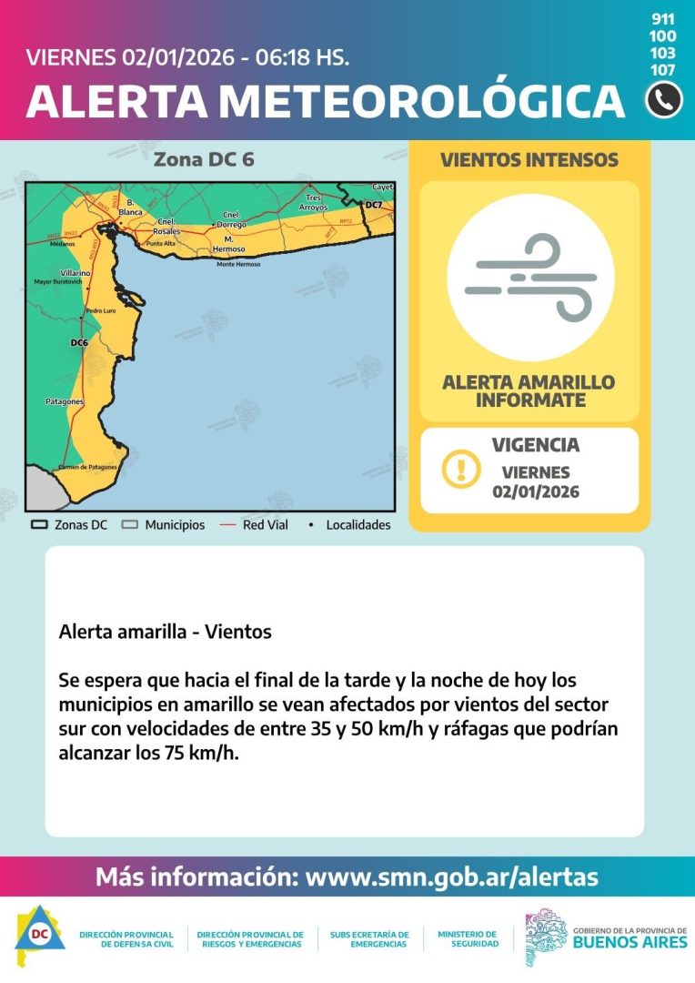 El municipio de nuestra ciudad, a traves del Servicio Meteorologico indico que se espera que entre de las últimas horas de la tarde y la noche de hoy, los municipios en amarillo sean afectados por vientos del sector sur con intensidades entre 35 y 50 km/h.