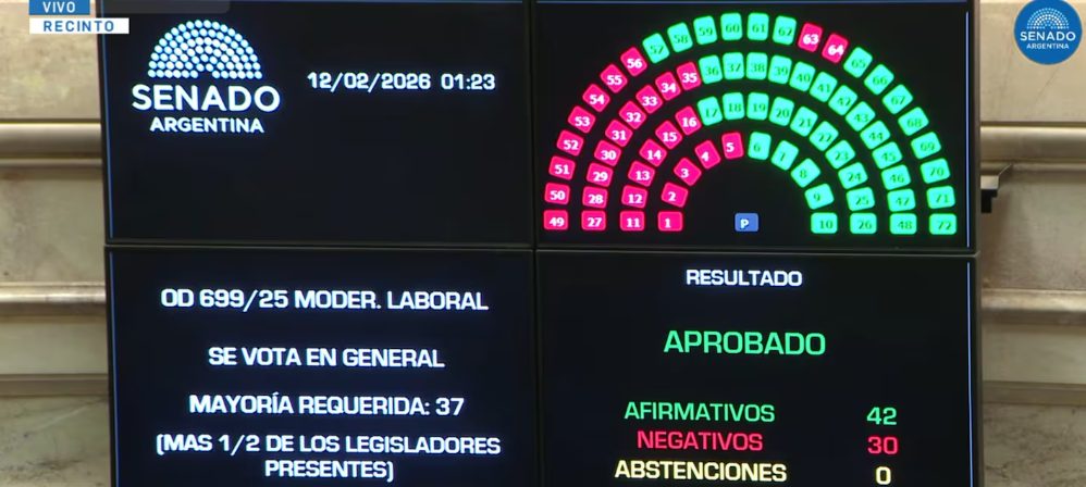 El Senado obtuvo la media sanción de la reforma laboral con 42 votos a favor y 30 en contra. Ahora, el proyecto pasará a la Cámara Baja donde el oficialismo tiene la primera minoría.