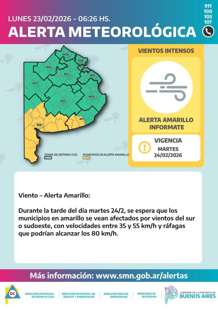 Informe del Servicio Meteorologico Nacional indica un martes con baja probabilidad de lluvias y algunas tormentas aisladas durante la madrugada (entre las 3 y 6 h), sin acumulados relevantes. Vientos intensos, con ráfagas fuertes de hasta 75 km/h durante la madrugada y las primeras horas de la mañana (aproximadamente entre las 4 y 8 h).