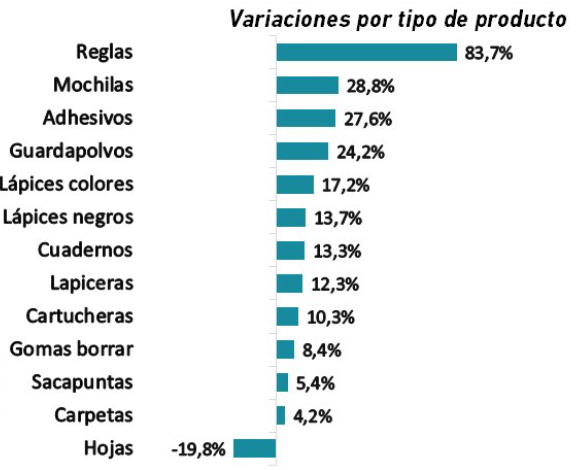 Reglas, mochilas, adhesivos, guardapolvos y lápices de colores, son los elementos con mayor variación en porcentaje , en los últimos 365 días