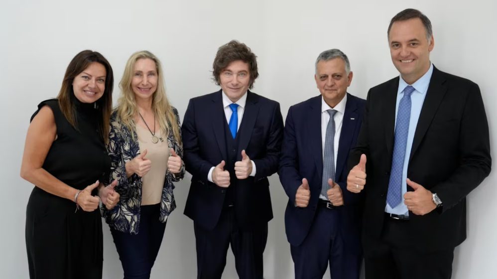 “Ganamos el juicio de YPF!!!TMAP.MAGA.VLLC!“, escribió el mandatario al poner una serie de sus acrónimos favoritos, ademá de una foto en la que aparece sonriente junto a su hermana, la secretaria de Presidencia Karina Milei, la ministra de Capital Humano, Sandra Pettovello, el CEO de YPF, Horacio Daniel Marín, y el jefe de Gabinete, Manuel Adorni.