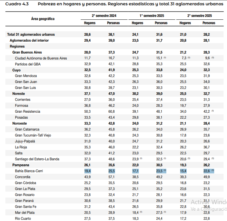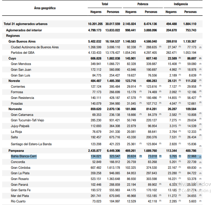 Si se refiere a personas sobre un total de 323.547 personas que conforman Bahia Cerri, se registran 73.018 pobres y 22.968 indigentes.