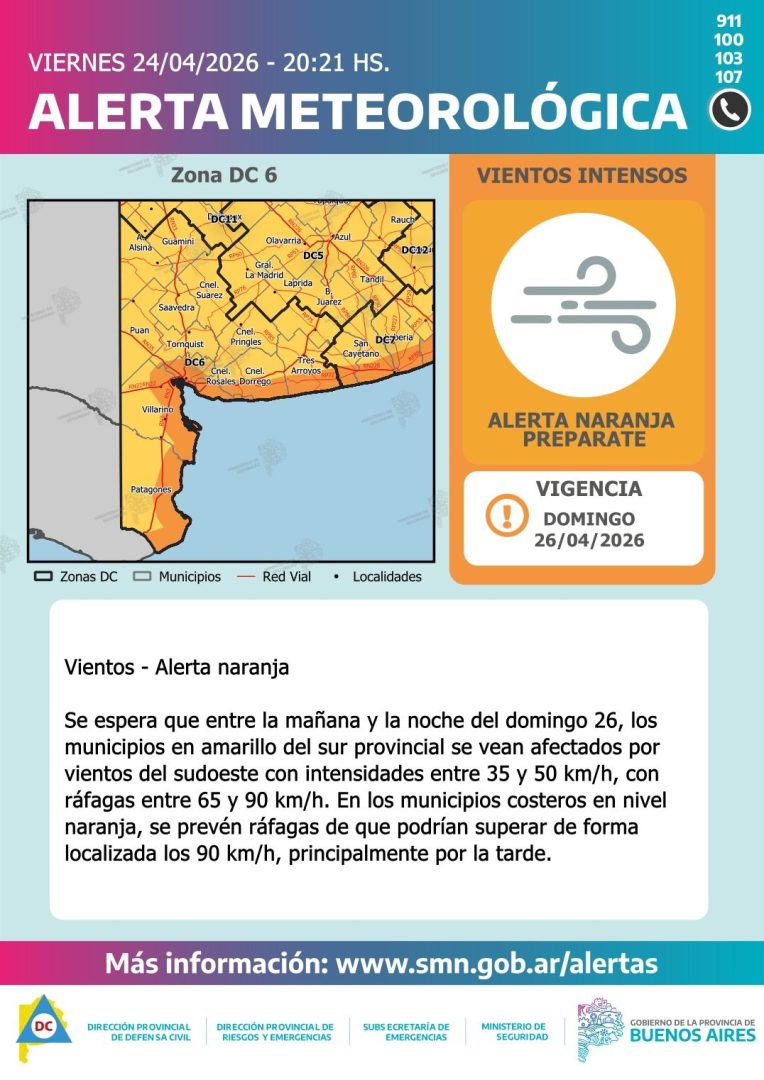 El viento sostenido va a rondar en 30 y 45 km/h y las ráfagas pueden alcanzar los 90 km/h. Se prevé que comience a notarse el aumento del viento desde las 5-6 am, con el pico máximo de intensidad entre las 12 y 15 hs. Luego, lentamente la intensidad va a ir mermando, con ráfagas por debajo de los 60 km/h desde la medianoche del mismo domingo.