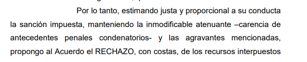 En relación con Mejuto, uno de los ejes del recurso fue la supuesta falta de fundamentación de la pena y la existencia de circunstancias atenuantes, como una presunta coacción ejercida por Rossi. No obstante, los jueces descartaron esa hipótesis al apoyarse en informes periciales que indicaban que Mejuto no presentaba rasgos de personalidad que evidenciaran una influencia determinante por parte de su coimputado.