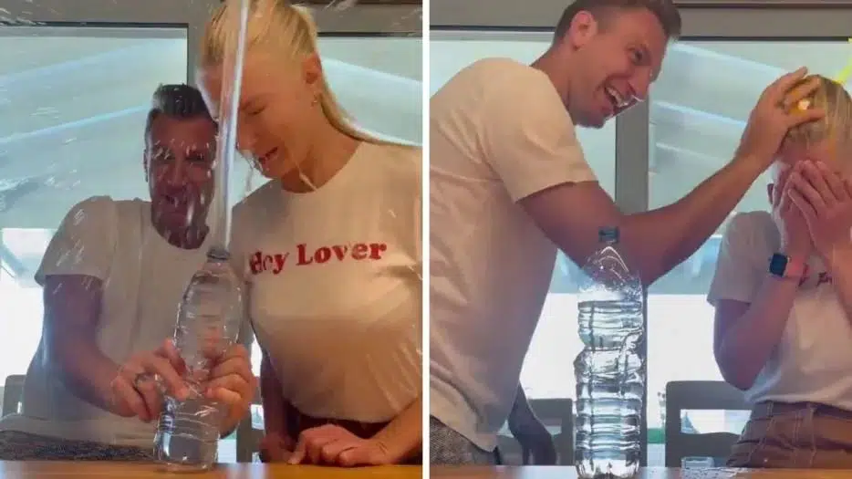 Pero a continuación, el futbolista agarró el huevo y le pidió a su pareja que mirara adentro del pico de la botella. Cuando se acercó, Maxi apretó la botella y toda el agua saltó hacia arriba, salpicando a la sueca. Por último, mientras Daniela se secaba la cara, Maxi le aplastó el huevo sobre la cabeza.