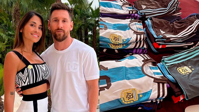 Muy dulce, Roccuzzo compartió un video con las prendas deportivas de la Selección que usarán sus hijos. En las imágenes se ven desde remeras hasta shorts, pilusos y gorras.