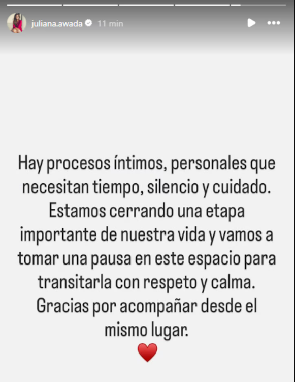 Luego, explicó cómo estaba transitando este momento. “Estamos cerrando una etapa importante de nuestra vida y vamos a tomar una pausa en este espacio para transitarla con respeto y calma”, expresó.