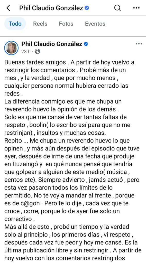 También relató un hecho ocurrido fuera de las redes, durante una fecha musical que produjo en Ituzaingó, donde un cruce con alguien del ambiente terminó en violencia física. “Probé más de un mes y por mucho menos cualquier persona normal hubiera cerrado las redes”, escribió, antes de aclarar que la situación superó todos los límites.