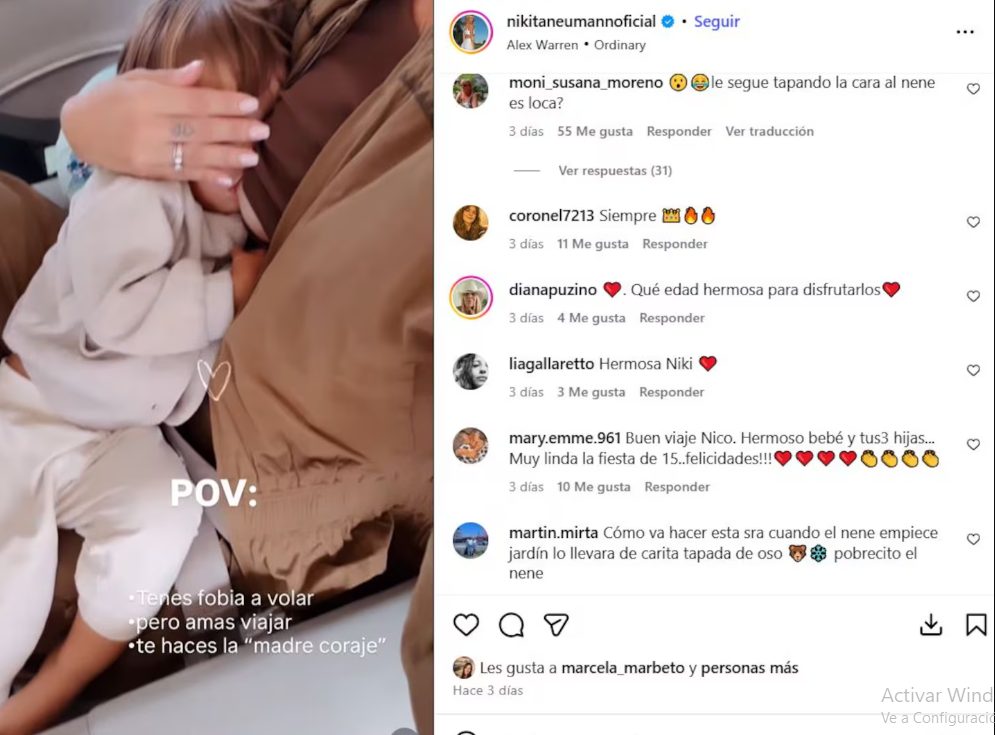 El posteo que hizo explotar las críticas fue uno donde se la vio en un avión con su hijo Cruz en brazos, a quien le tapó la cara con la mano.