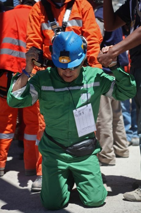 Omar Reygadas solo atinó a arrodillarse mientras sostenía una pequeña Biblia en su mano derecha. Llevaba un overol verde, una pequeña riñonera negra y un casco de minero con linterna, su nombre escrito con marcador negro indeleble y la inscripción “Dios vive”. Unos anteojos especiales lo protegían del sol después de tanta oscuridad.