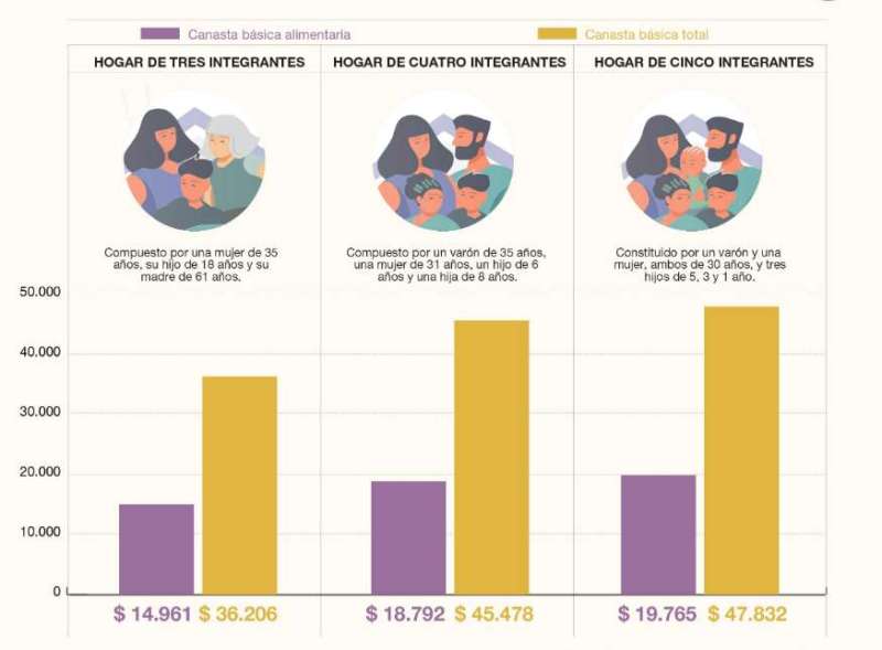 El Indec informó también que el costo de la Canasta Básica Total (CBT), que además de alimentos mide a otros rubros como indumentaria y transporte, se incrementó 2,1% en agosto, por lo cual el mismo grupo familiar necesitó contar con ingresos por $ 45.477,66 para no caer debajo de la línea de la pobreza.