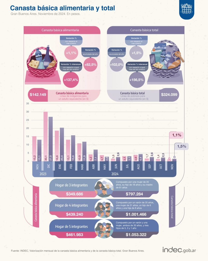 En noviembre, una familia tipo de cuatro integrantes necesitó $1.001.466 para no caer bajo la línea de la pobreza, según los datos del Instituto Nacional de Estadísticas y Censos (INDEC). Este incremento resulta llamativo, ya que es la primera vez que la Canasta Básica Total (CBT) supera el millón de pesos.
