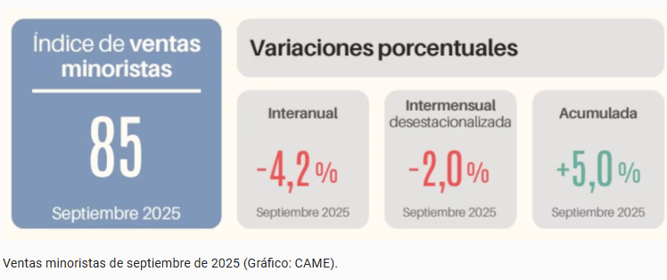 “Septiembre cerró con un retroceso generalizado en las ventas minoristas pymes, reflejando la fragilidad del consumo interno y el impacto de la incertidumbre económica y política”, señaló el informe.