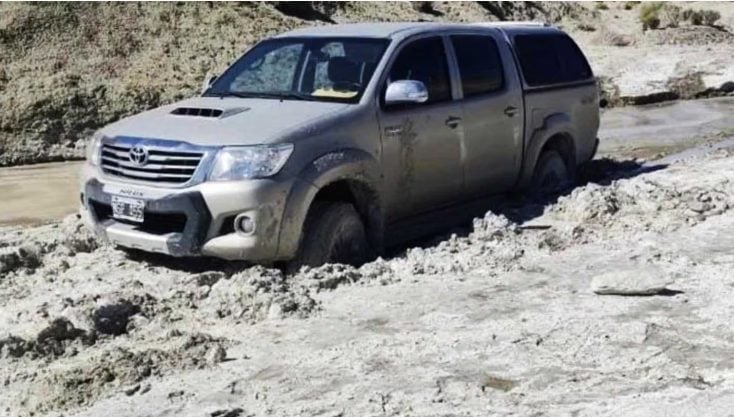 La imagen que publicó la policía sobre la camioneta demuestra, por el estado del suelo, que intentó salir del barro. Sin embargo, no tuvo éxito.