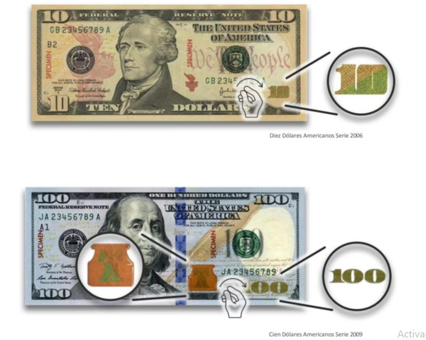 - Girar el billete. Al inclinar el billete se debe observar el cambio de color del número (de cobre a verde). En el billete de 100, observe la campana y el hilo 3D.