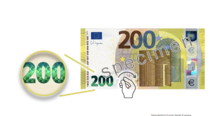 - Inclinar el billete. Girar el billete para detectar el cambio de color del número (verde a azul), el holograma con retrato y valor. En el caso de las de denominación 100 y 200, estos números incorporan el símbolo “€” en su interior.