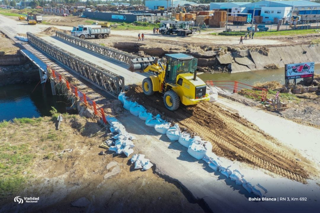 El 19º Distrito de Vialidad Nacional informa que continuarán mañana los trabajos tendientes al mantenimiento de los puentes provisorios instalados en el kilómetro 692,13 de la RN 3, específicamente en el carril descendente (sentido Gral. Cerri a Bahía Blanca).