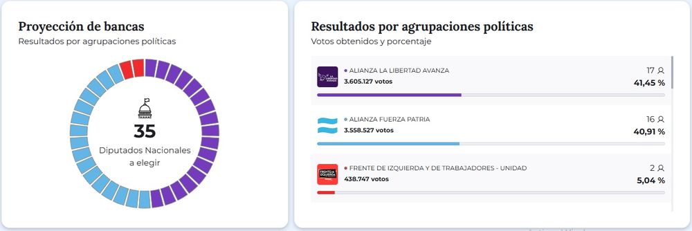 Hasta el momento, La Libertad Avanza cosechó 3.605.127 votos (41,45%) en la categoría de diputados nacionales por la provincia de Buenos Aires, seguida por Fuerza Patria con 3.558.527 sufragios (40,91%). Esto permitió meter 17 legisladores a la alianza de Javier Milei y 16 al peronismo. En tanto, el Frente de Izquierda de los Trabajadores –Unidad obtuvo 438.747 votos (5,04%) y sumará dos bancas, y el resto no llegó al piso de los 3 puntos.