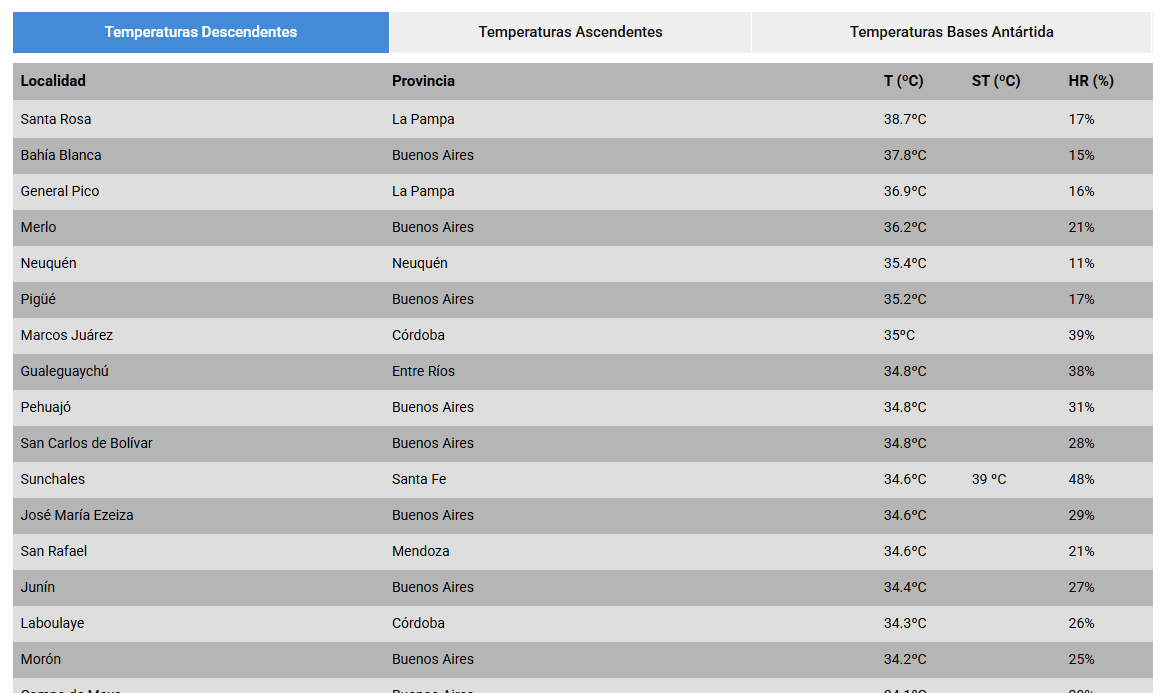 Este luns 29 de diciembre ha estado marcado por temperaturas extremas que superaron los 34 GRADOS en gran parte del norte y centro del país. Según el ranking de temperaturas del Servicio Meteorológico Nacional (SMN), a la hora 16, las siguientes ciudades se posicionaron como las más calurosas de la jornada: Santa Rosa (La Pampa), Bahia Blanca, General Pico (La Pampa) y Merlo (Buenos Aires) lideran el ranking