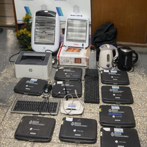 En el lugar, los efectivos constataron la presencia de nueve computadoras portátiles del Gobierno, de color negro, un router blanco, dos teclados (uno negro marca DELL y otro gris marca GENIUS), un mouse marca CORADIR, una impresora marca HP color gris, un termo de aluminio color gris, dos pavas eléctricas (una blanca marca PHILIPS y una negra marca MOULINEX), y dos estufas halógenas blancas, marcas ELECTROLUX y LILIANA.