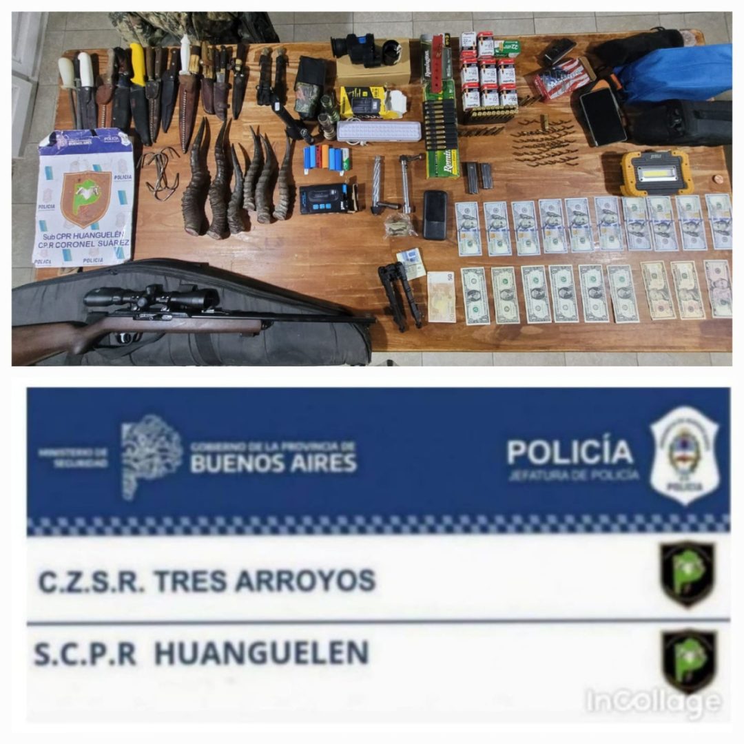 Se incautaron 66 municiones calibre .308, 512 municiones calibre .22, 92 municiones calibre .270, 10 culotes con vainas, cuatro chairas, dos cerrojos de fusil (calibres .308 y .270), dos bípodes, un chaleco de transporte, dos luces de emergencia, cinco linternas de mano, un monocular con funda, cuatro cargadores, un visor nocturno, dos cargadores portátiles, tres pares de cornamentas de antílope y tres ganchos de carnicero de metal.
