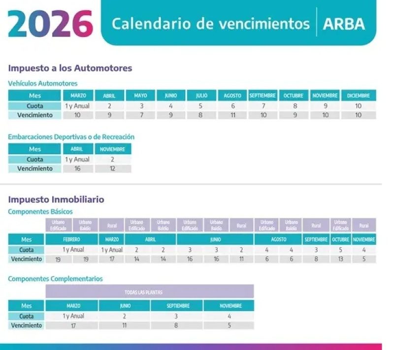 La Agencia de Recaudación de la provincia de Buenos Aires (ARBA) informó el calendario de vencimientos 2026 correspondiente a los impuestos patrimoniales, que incluye al Impuesto Inmobiliario —en sus componentes básico y complementario— y al Impuesto a los Automotores, alcanzando también a embarcaciones deportivas o de recreación.