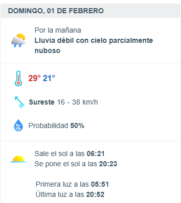 El Domingo, 1 de febrero, la temperatura bajará notablemente y tendremos cielo nuboso con chubascos tormentosos (probablemete antes del mediodía). La minima oscilará en 21 grados, mientras que la máxima será de 29 grados