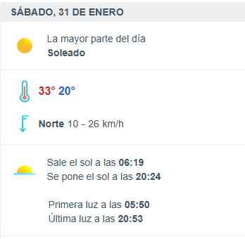 Segun el Servicio Meteorologico Nacional, este Sábado 31 de enero se esperan soleado en Bahía Blanca. La temperatura mínima será de 20°C, y la máxima de 33°C.