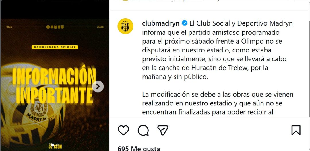 Desde la institución explicaron que las condiciones actuales del escenario impiden “recibir al público y desarrollar el encuentro con normalidad”, motivo por el cual se resolvió el cambio de ciudad y estadio. En el mismo texto, Deportivo Madryn agradeció “la comprensión de nuestros socios e hinchas” y señaló que continúan trabajando “para brindar las mejores condiciones en nuestra casa”.