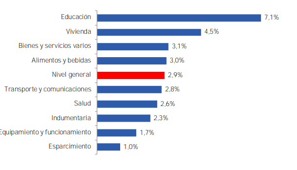 Bienes y servicios varios se posicionó en tercer lugar con una variación del 3,1%, traccionado por incrementos en servicios de peluquería y para el cuidado personal (6,3%), cigarrillos y tabaco (3,5%) y artículos de tocador descartables (2,6%), entre otros.